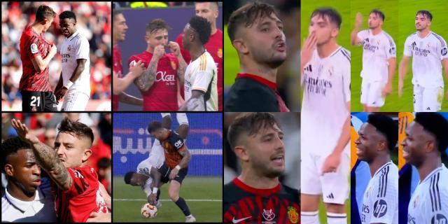 就那档节目的无厘头基调,马费奥显然是在开玩笑。但这场比赛他继续和维尼修斯纠缠显然不是为了搞笑,而是带着任务来的。维尼修斯易怒几乎无人不知,每个不讲武德的对手都想利用一下。马费奥和维尼修斯对位,两人一有接触,他就凑过去要便宜。维尼修斯轻轻挡了一下,马费奥立刻像中枪一样倒在地上打滚,半晌不肯起来。全场人加上转播观众都懵了:这演技也太差了。